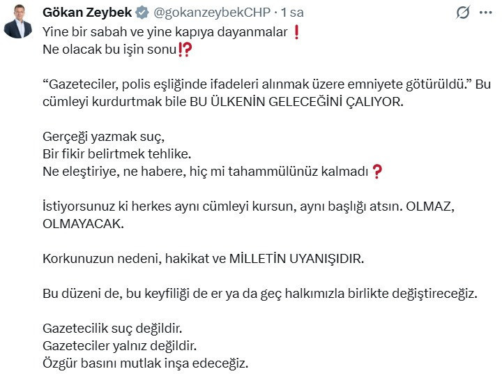 CHP Genel Başkan Yardımcısı Gökan Zeybek, gazetecilerin evleri basılarak gözaltına alınmasına tepki gösterdi. Zeybek konuya ilişkin yaptığı açıklamada, “Bu düzeni ve keyfiliği halkımızla birlikte değiştireceğiz” ifadelerini kullandı.