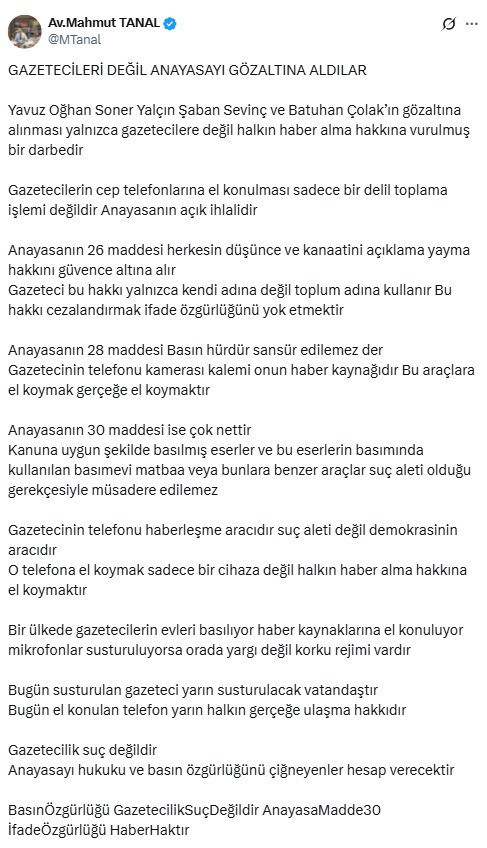 CHP Şanlıurfa Milletvekili Mahmut Tanal, gazetecilere yönelik operasyonun ardından sosyal medya hesabından uzun bir açıklama yayımladı. “Gazetecilik suç değildir. Anayasayı hukuku ve basın özgürlüğünü çiğneyenler hesap verecektir.” diyen Tanal’ın açıklamasının tamamı ise şöyle:
